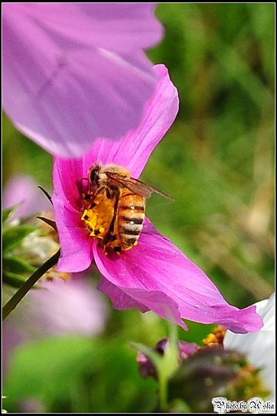 沒有微距鏡更沒有長鏡頭,這樣的蜜蜂採蜜特寫實在是很難拍ㄚ。